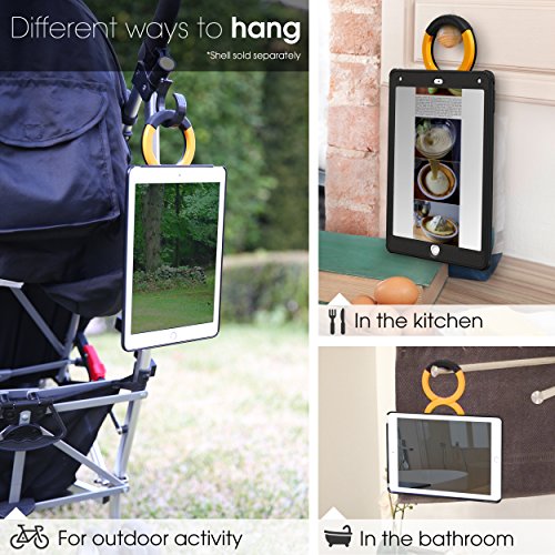 Orb Loop features hook, stand, and handle all in one. Fold into stand position for landscape or portrait viewing.