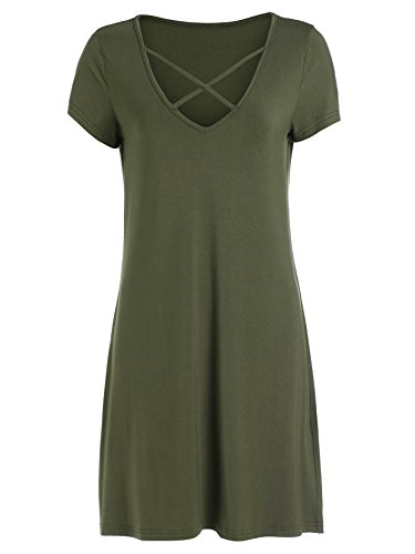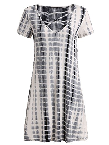 Above knee high, V Neck, criss cross in front, short sleeve, loose bottom.