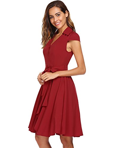 Features: Lapel Collar, Cap Sleeve, V-Neck, Knee-Length Hemline, Swing and Faux Wrap design, High Waist, Solid Pattern, Side Hidden Zipper, Removable Matched Belt, Have Buttons at Front