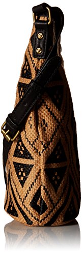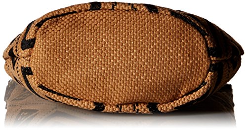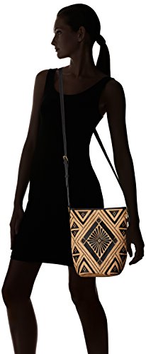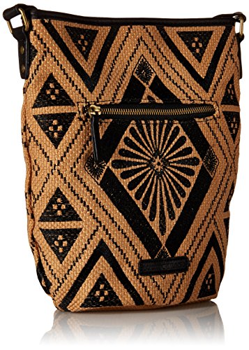 Linen bucket crossbody with embroidered embellishments and adjustable faux leather crossbody strap