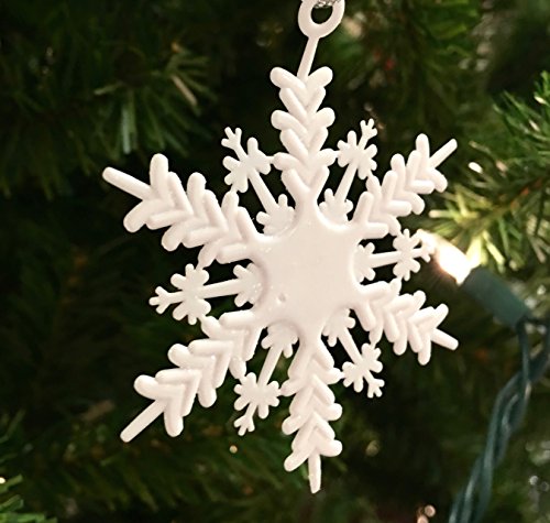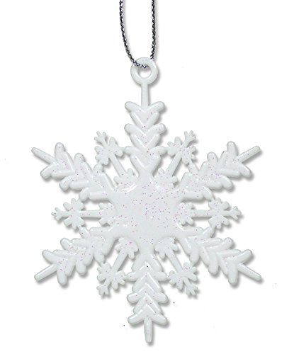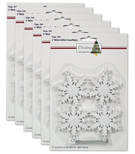 MINI CHRISTMAS ORNAMENTS. Big pack of 96 small white glitter snowflake ornament. 2" diam. White plastic snowflakes are great to hang on a mini Christmas tree, small door wreath or sting together to make a snowflake garland decoration.