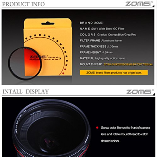 Colors:Gradual Orange/Blue/Gray/Red Filter frame:Aluminum frame Frame thickness:1.35mm Frame height:4.69mm Material:High quality optical resin.