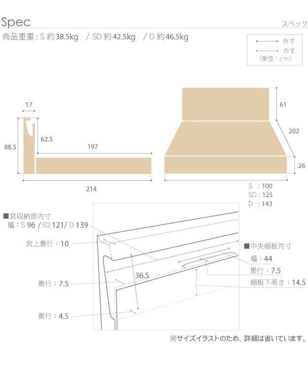 中央棚板部:幅44x奥行7.5cm・下高さ14.5cm
