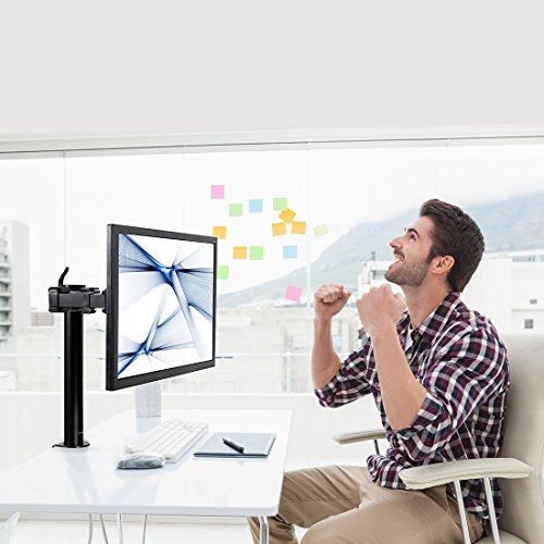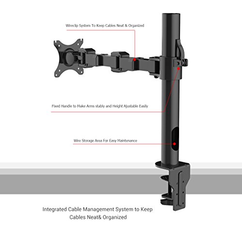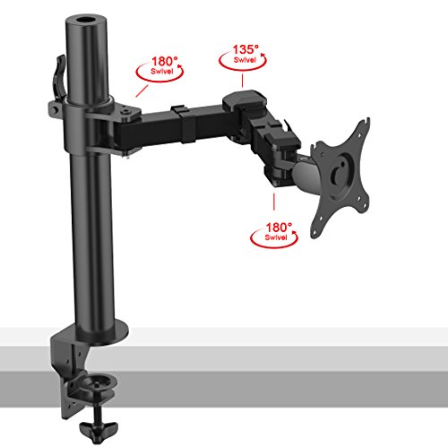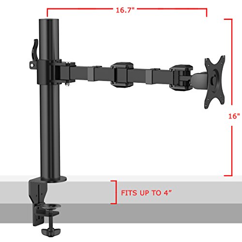 - Feature : Innovative desktop PC monitor desk riser that mounts Samsung, Acer, Viewsonic, LG, Dell, HP, Asus, AOC flat panel LCD and LED displays from 10" to 30" (10, 15, 19, 20, 23, 24, 27 and 30 inch monitors). Compatible with VESA 75 x75 mm and VESA 100 x 100mm. / Height adjustable for a more comfortable viewing experience. Each monitor can tilt up or down 15 degrees, swivel 360 degrees and rotate 360 degrees. Rotating the monitor holders allows landscape or portrait positioning. / Improve the ergonomics of your office workstation by raising to monitors to an ergonomic height on your desktop, depending on your sitting position. Avoid neck, shoulder and back pain by improving your posture. / It will clear up space on the desktop for your keyboard, laptop or other items. Depending on the user and desk height, this mounting bracket can be used for standing desk applications. The pole measures 16 inches. / Heavy-duty design supports up to 22 lbs monitor. C clamp base has integrated one lock that ensures stable mounting onto the desks. This monitor stand can be mounted on tables up to 4 inches thick. Arm come with clips for cable management.