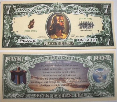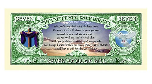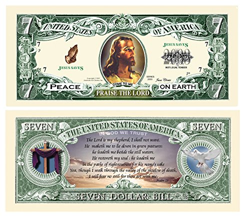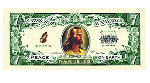 ReleaseDate : 2017-10-17 Studio : American Art Classics Publisher : American Art Classics Binding : Toy Product Description The Praise The Lord-Jesus 7 dollar bill is a beautifully printed item. Approximately the same size as real US currency and printed on both the front and back of the bill. These bills are great to give out anytime of year or during the Easter and Christmas Holiday season. 0