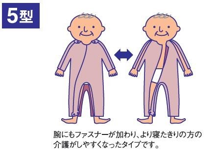 両腕にもファスナーが加わり、より着替えや清拭がスムーズに行えます。右足首から胸元のファスナーと、股部分のファスナーで、おむつ交換などの介護が楽にできます。