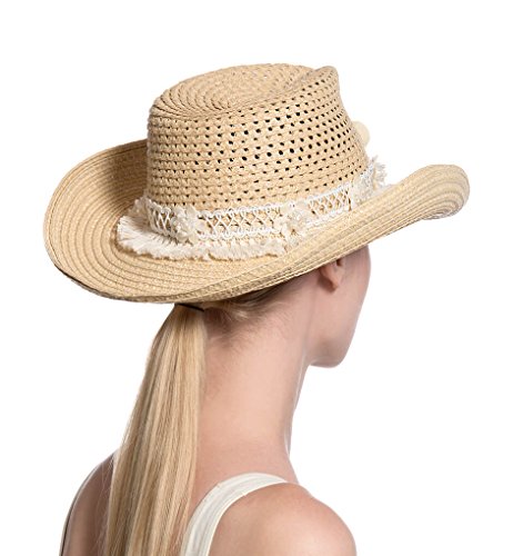 Binding : Apparel Product Description Western style hat of Squishee® with mother of pearl flower trim and cotton fringe adorning the crown. Elasticized inner band fits most. This vented straw style has a double faced brim which is 50 UPF protective. Lightweight and packable. Blocks 95% UVA/UVB rays. Independent testing in accordance with AATCC (American Association of Textile Chemists and Colorists) test methods have determined this product's effectiveness for blocking ultraviolet radiation as well as UVA/UVB radiation. This product was awarded the highest rating of 50 UPF by independent testing. To learn more about AATCC testing, go to www.aatcc.org. The crown's open weave does not provide sun protection to the top of the head. 0