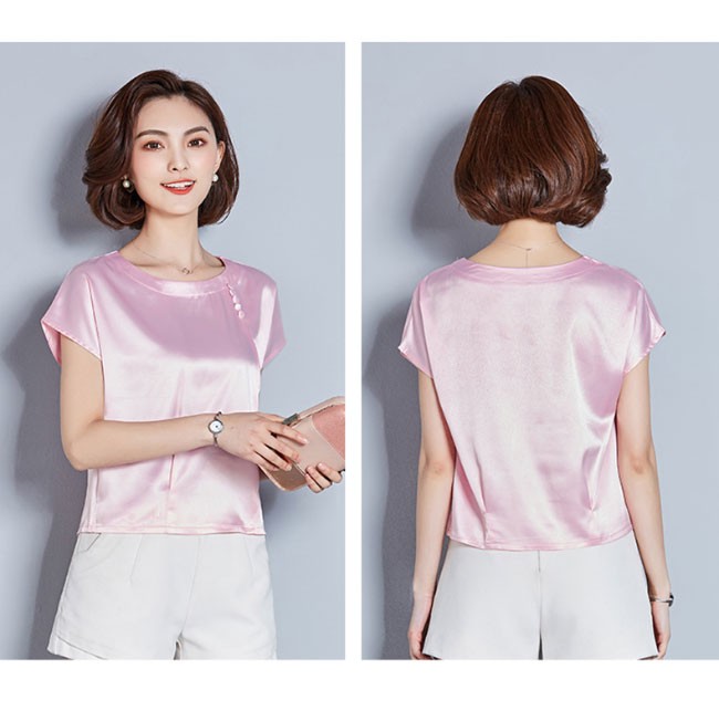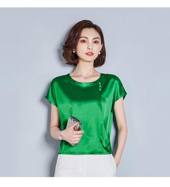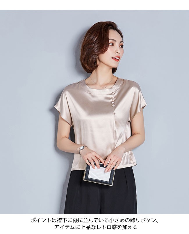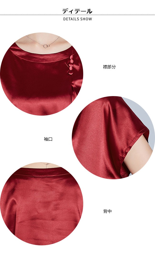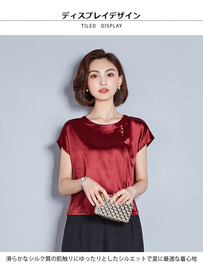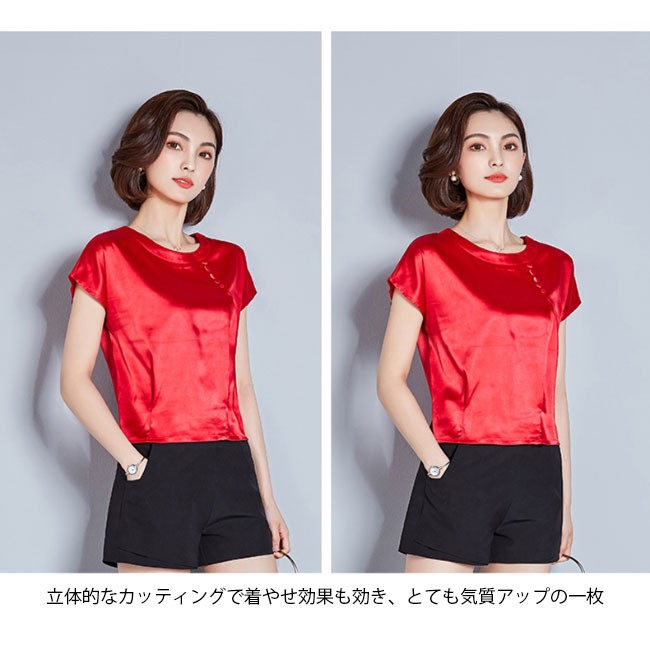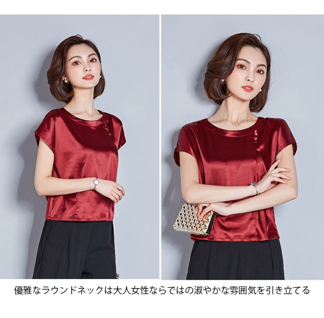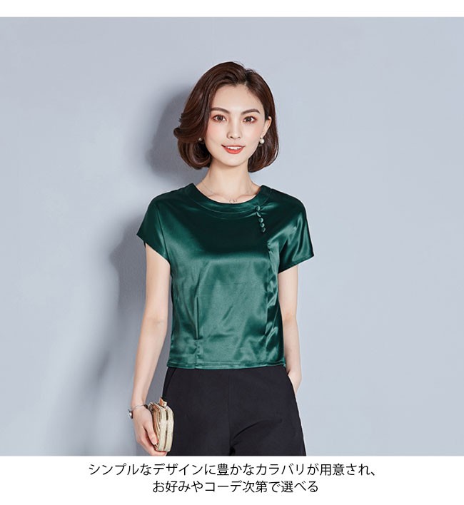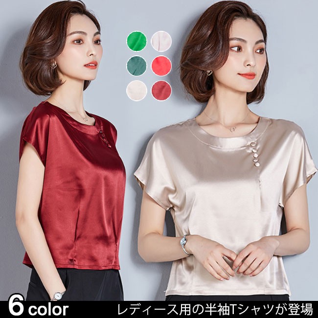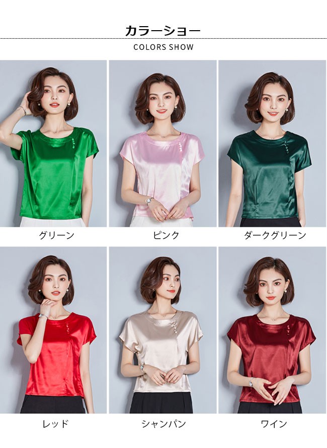 半袖Tシャツ レディース 丸襟 女性用 Tシャツ ゆったり カットソー 女性用 トップス 半袖 夏物 薄手 通勤 着まわしレディース用の半袖Tシャツが登場滑らかなシルク質の肌触りにゆったりとしたシルエットで夏に最適な着心地優雅なラウンドネックは大人女性ならではの淑やかな雰囲気を引き立てるポイントは襟下に縦に並んでいる小さめの飾りボタン、アイテムに上品なレトロ感を加える立体的なカッティングで着やせ効果も効き、とても気質アップの一枚シンプルなデザインに豊かなカラバリが用意され、お好みやコーデ次第で選べるカラー:グリーン ピンク ダークグリーン レッド シャンパン ワイン素材 ポリエステルサイズ(cm) M L XL 2XL 3XL 4XLM バスト96 着丈54L バスト98 着丈55XL バスト102 着丈552XL バスト106 着丈563XL バスト110 着丈574XL バスト114 着丈58ご注意:※サイズは平置きサイズです。素人採寸ですので、若干の誤差がございます、ご了承ください。