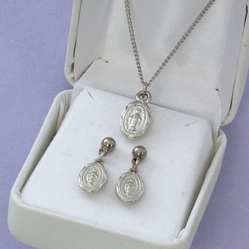 -. Title : First Communion Silver Tone Miraculous Pendant and Earring Set
