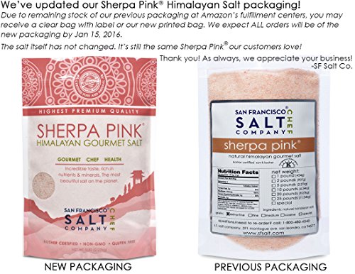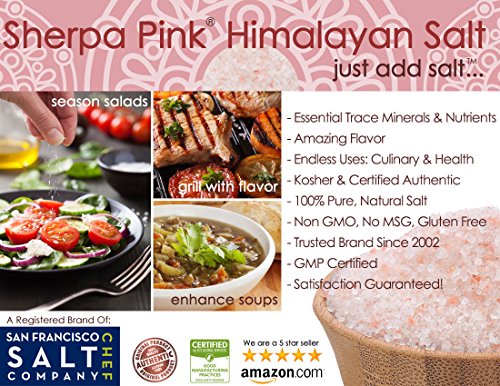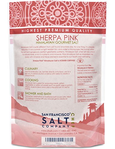 - Feature : TASTES GREAT -- Our 100% pure Himalayan pink salt tastes great and is certified Kosher. Sherpa Pink Himalayan salt is great for seasoning meats, grilled vegetables, a variety of salads (such as pasta, egg or potato salads), soups & stews and is also a flavorful salt to use for baking. / 100% NATURAL PINK & CERTIFIED -- We import ONLY the highest quality food grade Himalayan salts and package in our U.S.A, GMP certified packaging facility that is 3rd party audited, by SCS Global. / HEALTH BENEFITS -- Himalayan salt has become well known for its amazing health benefits. It re-mineralizes the body with minerals and trace elements essential to our health and well being. Our Himalayan pink salt is rich in trace minerals - including Calcium, Magnesium, Potassium, Copper and Iron. / 100% MONEY BACK GUARANTEE - The San Francisco Salt Company is confident that you will be happy with the quality of our products and stand behind every single item. If you are not satisfied with your purchase return the product for a full refund. / AVAILABLE IN 3 GRAIN SIZES -- Sherpa Himalayan pink salt is available in Extra-Fine, Fine and Medium Grain Sizes. If you're looking for a very small size grain try our best selling Extra-Fine size. If you want a larger grain to grind yourself try our Medium size. PLEASE SEE GRAIN COMPARISON IMAGE (AT LEFT) TO CHOOSE THE GRAIN THAT BEST SUITS YOUR NEEDS.