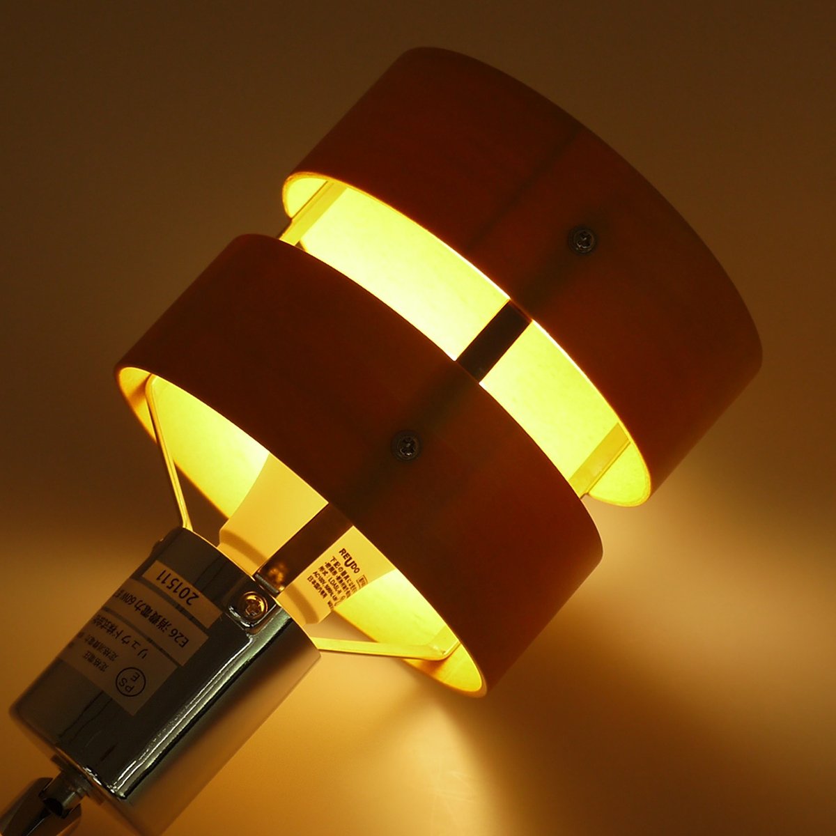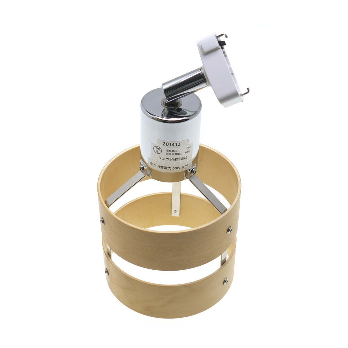 A spotlight with a ceiling connection hooked with a chrome-plated body and a wooden two-piece shade combined.