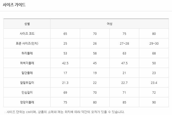 | 치수 | 실측(90)사이즈(cm)-허리둘레74 엉덩이둘레96 허벅지둘레56 밑단둘레32 총장102 |