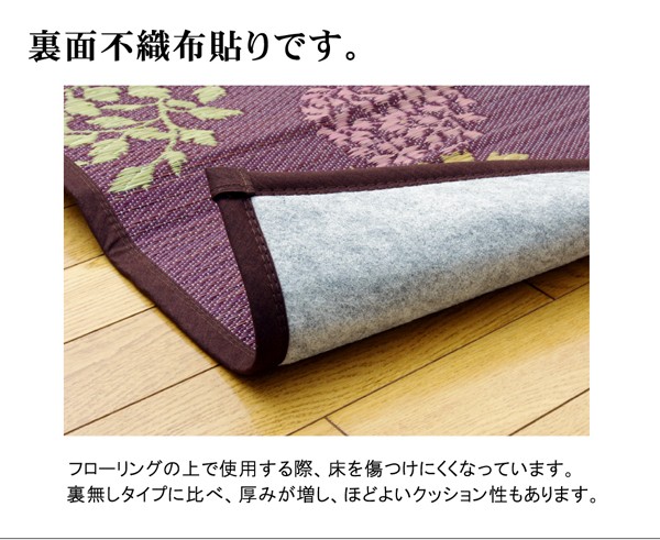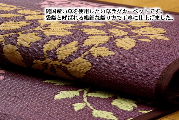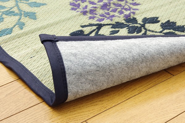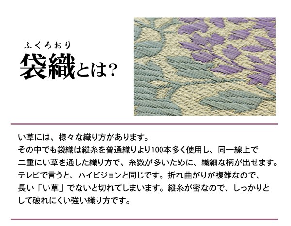 縦糸の本数が多い袋織りという技法で繊細な柄を出しています。折れ曲がりが複雑なので長いイ草を使用しないと切れてしまいます。縦糸が密なので、しっかりとして破れにくいのが特徴です。国産(九州産)のい草を使用しています。一本一本が太く、表皮が厚く繊維がキメ細かいので弾力性があり、耐久性に優れています。い草には空気の自然浄化作用、湿度の調節作用などがあります。また汚れにくく、使用するうちに黄金色に変化し味が出ます。い草に青森ヒバ加工を施しています。(抗菌、防臭効果)