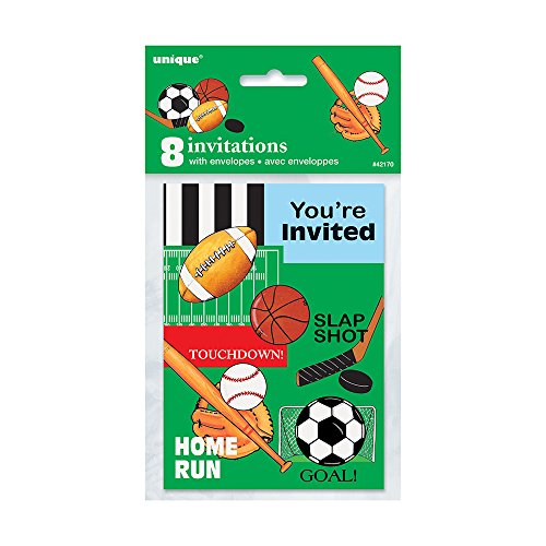 - Classic Sports Party Invites measure approximately 5.5" x 4" and include envelopes