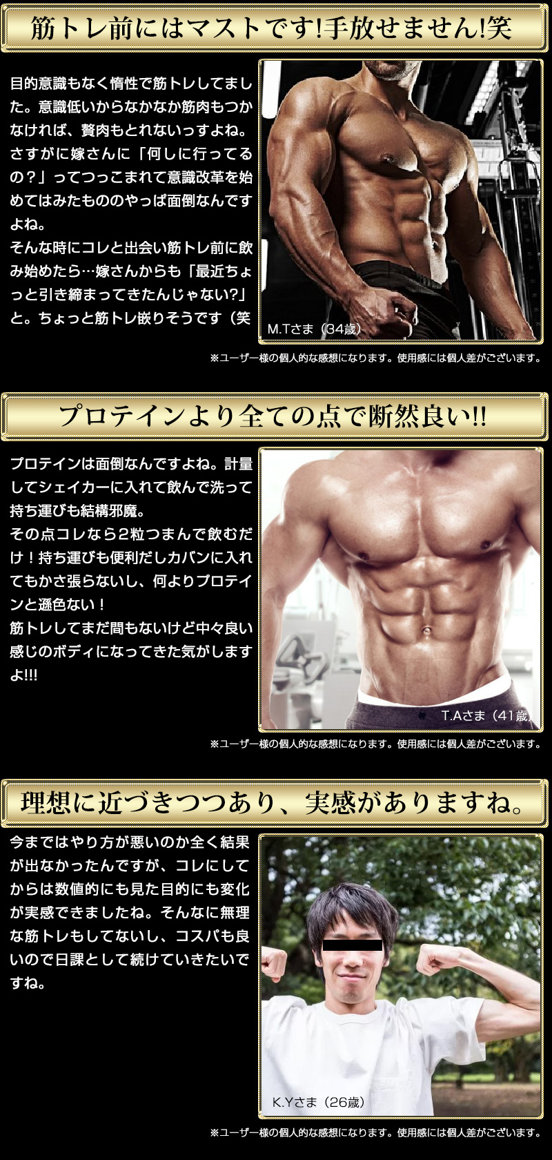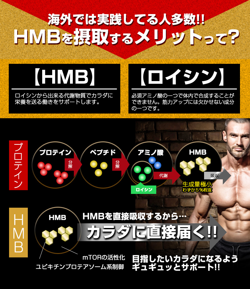 原材料 HMBカルシウム、乳たんぱく質(乳成分を含む)、クレアチン、亜鉛含有酵母、黒胡椒抽出物、ブラックジンジャー抽出物(ブラックジンジャー抽出物、デキストリン) / セルロース、活性炭、ステアリン酸カルシウム、微粒酸化ケイ素、L-バリン、L-ロイシン、L-イソロイシン、L-グルタミン、L-アルギニン、ビタミンC、シクロデキストリン、ビタミンE、ナイアシン、パントテン酸Ca、ビタミンB2、ビタミンB1、ビタミンB6、ビタミンA、葉酸、ビタミンD、ビタミンB12
