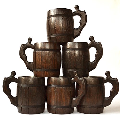 Handmade Beer Mug Set of 6 Wood Natural Stainless Steel Cup Men Gift Eco-Friendly Barrel Souvenir Round Brown