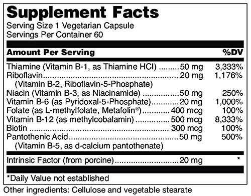 Douglas Laboratories® B-Complex is unique, including Metafolin®, Methylcobalamin Vitamin B12, and Intrinsic Factor in its formulation. Metafolin® contains only the S isomer of 5-MTHF and has been shown to be the only form of folate to be able to cross the blood-brain barrier. Studies indicate that methylcobalamin, a coenzyme form of B12, may be better utilized and better retained in the body. Intrinsic factor is a protein produced by cells in the stomach lining and is needed for the intestines to absorb vitamin B12 efficiently.Feature