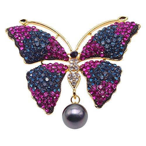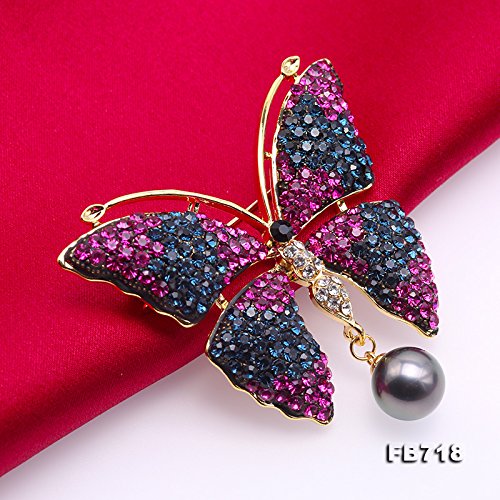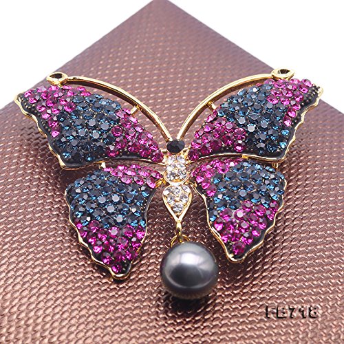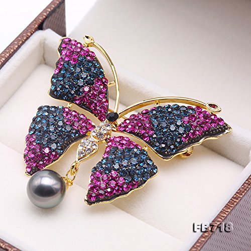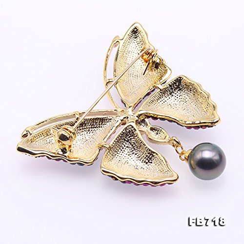 Description *Gorgeous Tahitian pearl brooch with colorful butterfly design. The lively butterfly is inlaid with sparkling zircons, with a 9.5mm black Tahitian pearl hanging from it.