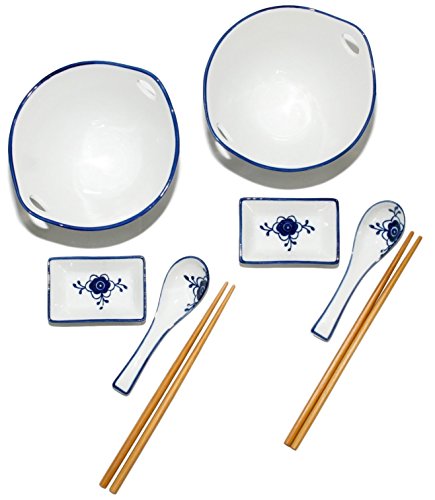 [Product Information]- Service for two includes: Two blue and white porcelain noodle bowls (SIZE), two sets of chopsticks, two hooked spoons with attractive blue and white design, and two sauce dishes