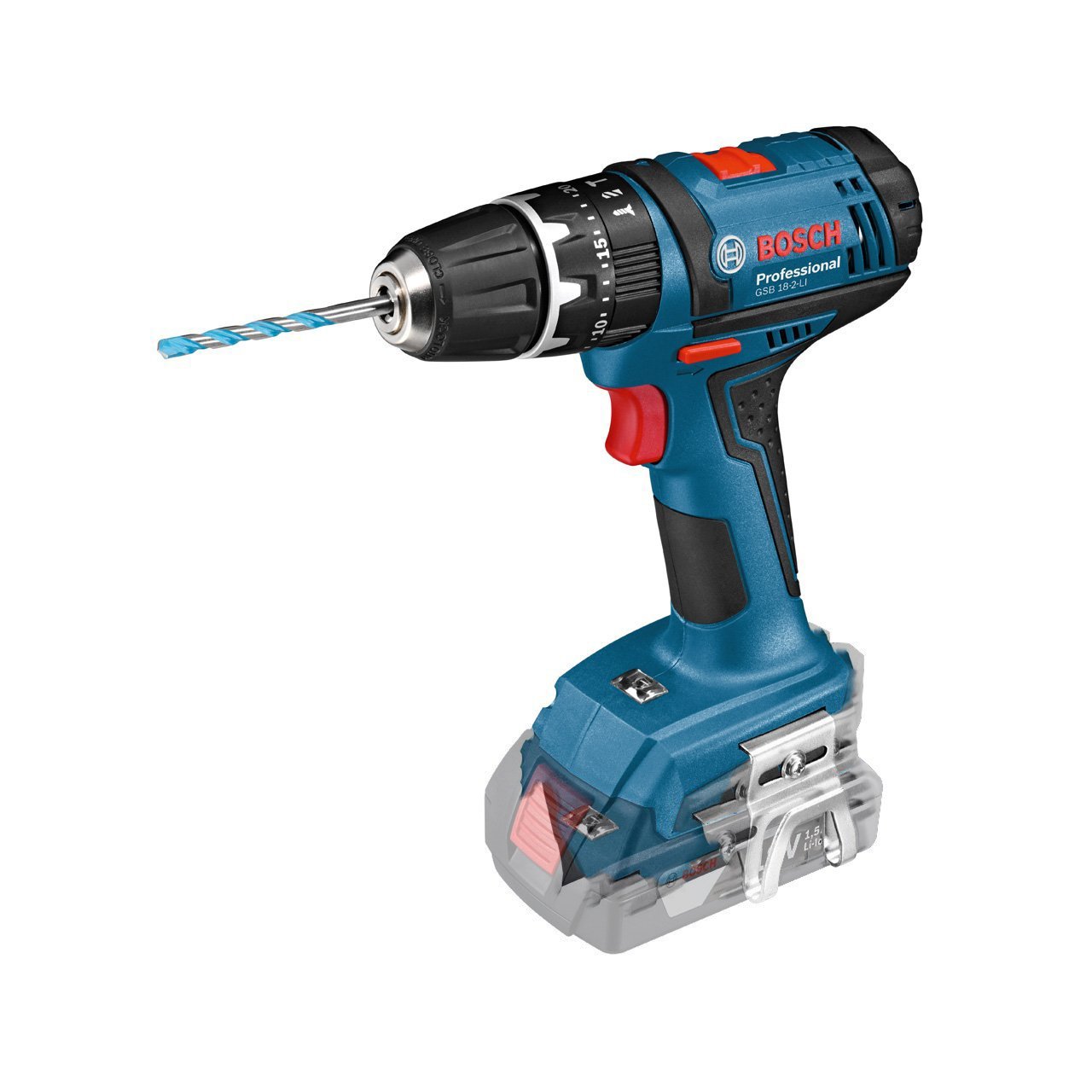 GSB 18-2-LI cordless combi Lowest weight: only 1.4 kg for perfect handling and low user fatigue Newly developed 2-speed planetary gearbox for powerful screwdriving and drilling applications in wood (30 mm) and metal (10 mm), and impact drilling in masonry (10 mm) At 187 mm it has the shortest design in its class for optimum handling, especially when performing drilling and screwdriving applications overhead and in tight spaces Professional quality 10 mm Auto-Lock drill chuck Bosch Electronic Cell Protection (ECP): protects the battery against overload, overheating and deep discharge Integrated LED light for illuminating the work area, even in dark places Practical belt clip keeps the tool within reach at all times Technical data Battery voltage: 18 V Max. drilling diameter in masonry: 10 mm Max. screw diameter: 7 mm