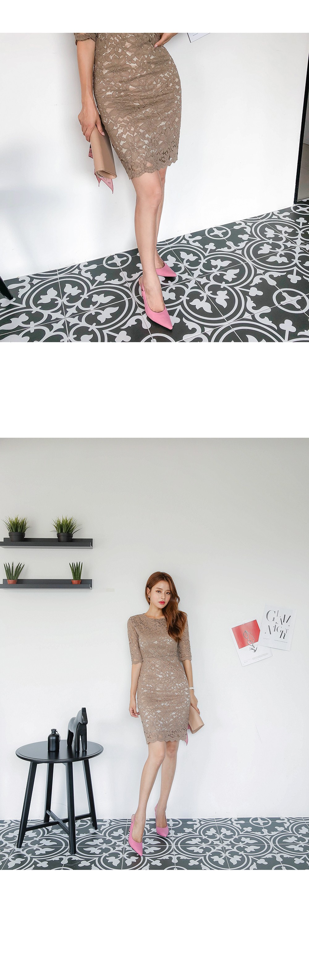 페미닌하면서도 로맨틱한 무드로 연출해 드릴 원피스를 소개해 드려요~ 미디 기장감으로 안정감있게 착용하실 수 있으며 레이스 소재감으로 여성스러운 느낌이 물씬 풍기는 아이템이랍니다! 바디라인에 타이트하게 핏되어 군살을 쏙 잡아 주면서 여리여리한 실루엣으로 완성시켜 드려요 하객룩,데이트룩,데일리룩 등 다양한 연출이 가능하며 유행을 타지 않을 클래식한 매력으로 소장가치 높은 아이템이랍니다! 안감이 덧대어져 비침 걱정없이 편안하게 착용 하실 수 있으며 단아하면서 여성스러운 무드로 완성시켜 드릴 원피스에요 평소 44반 사이즈의 현옥모델은 Free(44-66)사이즈를 편하게 착용하였으며 44사이즈 분들부터 66사이즈 분들까지 추천해드려요