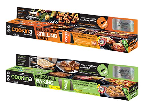 -. Feature : Saves Money - Cookina Grilling and Cooking Sheets are the reusable, dual-sided 100% non-stick alternative to aluminum foil, wax paper, and parchment paper / Saves Time - Cookina's easy cleanup takes less than a minute, plus it virtually eliminates the need to clean grill grates and other cooking surfaces / Eat Healthier - Cookina eliminates the need for additional cooking sprays or butter, so you can easily cook with less fat and calories while retaining the delicious flavor and nutrients in your food / Safe to Use - Cookina is constructed from high-quality materials, is ideal for high temperatures, and holds no odors or flavors from previous uses--even with fish, poultry, and marinades / This pack includes one reusable Cookina Barbecue Non-Stick Grilling Sheet (15.75" x 19.68"), one reusable Cookina Cuisine Non-Stick Cooking Sheet (15.75" x 23.62"), and two Cookina Storage Rings