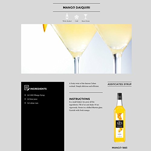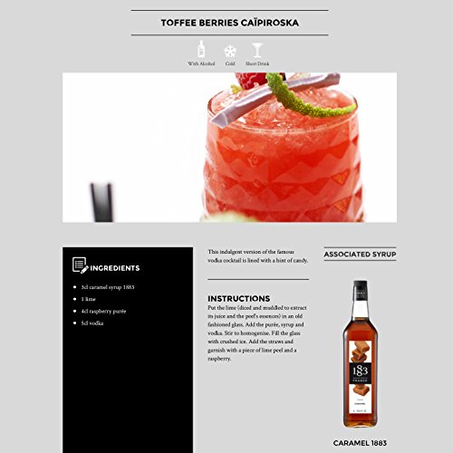 -. Binding : Grocery -. Brand : 1883 -. Feature : Includes 1 Liter High Quality Plastic Bottle with Resalable Lid, shipped Prime to you. / Use our FREE recipes to make your new favorite delicious beverage! / 1883 delivers a pitch-perfect performance for the senses with an unmistakable purity that says "Made in France" / Don't miss out on our killer seasonal money saving deals! Click "Add to Cart" Now! -. IsAdultProduct : 0 -. Label : 1883 -. Manufacturer : 1883 -. PackageQuantity : 1 -. ProductGroup : Grocery -. ProductTypeName : GROCERY -. Publisher : 1883 -. Studio : 1883 -. Title : Maison Routin 1883 Premium Syrup Flavorings - Purly Made in France, 1L Bottle