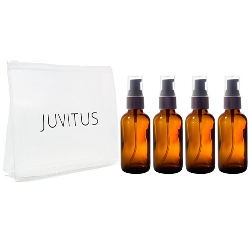 Amber Glass Boston Round Treatment Pump Bottle - 2 oz (4 Pack) + Clear Travel Bag Aromatherapy, Perfume, Essential Oils, DIY, Home, Travel