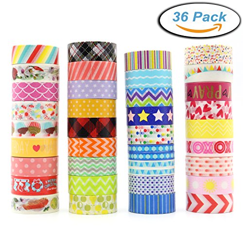 - 1. 36 ROLLS SUPER CUTE COLOR DESIGN: 36 packs washi tape with 24 solid patterns and 12 freedom patterns,Every tape of size is 0.2 in - 0.59in (0.5cm - 1.5cm) wide, 16.4ft (5m) long. All of the rolls are different patterns-Dots, Christmas boots, "HAPPY BIRTHDAY", Cake, "PARTY" word, Stripe, Ripple, Wave and Stars. It's very important, because if you use a fair amount, you will know how important variety is.