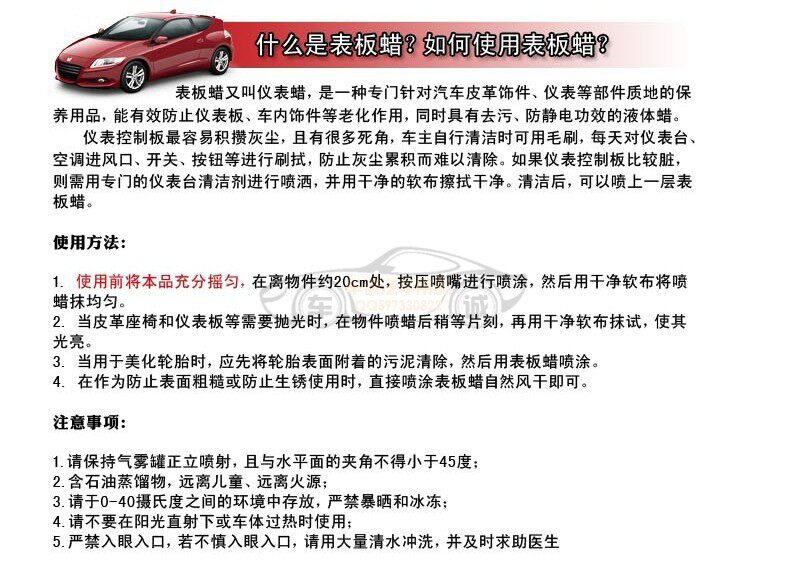 Increase surface gloss, decontamination dust, UV rays can effectively prevent the aging of plastics, and has anti-static, anti-corrosion and other excellent efficacy; easy to use, one touch spray, decontamination, glazing, protection once completed;