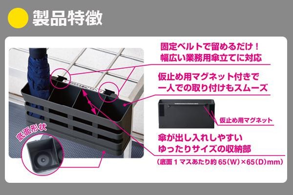 | オフィスや店舗の傘たてに固定ベルトで取り付けるだけで、簡単に折りたたみ傘の収納スペースを作ることができます。 |