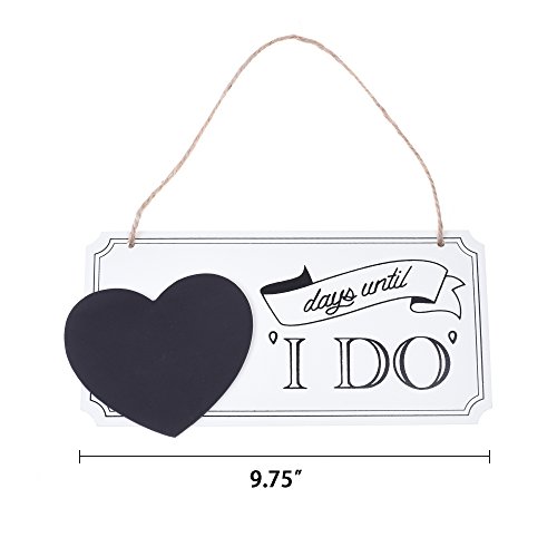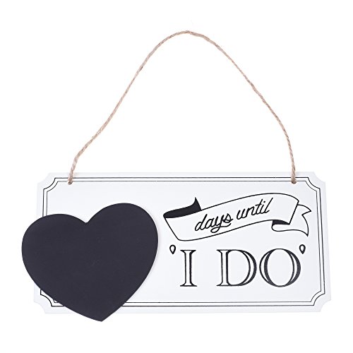 - A white hanging plaque with a large heart shaped chalkboard "days until I DO", It is sturdy and cute, with a twine for easy hanging
