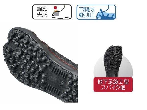 水がしみ込み難い構造の安全スパイクシューズです。多少の雨やぬかるみでも快適作業!!鋼製先芯入りで山仕事や草刈り作業も安心です。 |