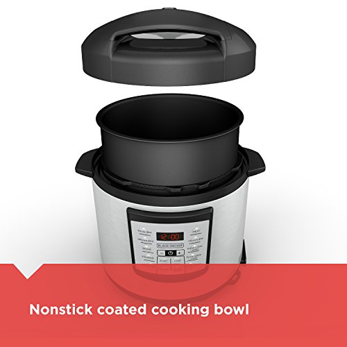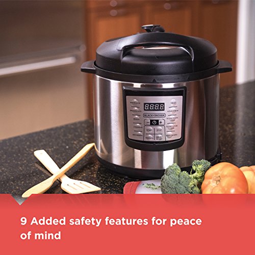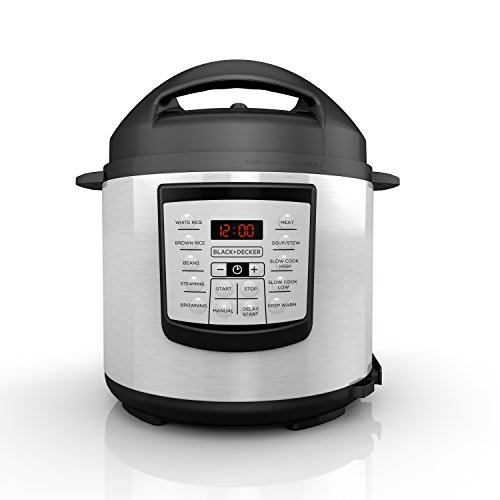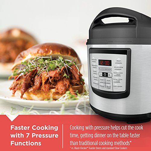 Turn up the pressure for faster cook times*! The BLACK+DECKER 7-in-1 6-Quart Electric Pressure Cooker gets your favorite meals to the table in an instant by sealing in heat, steam, and flavor throughout the cooking process. Choose from 7 dedicated pressure functions to make all your favorites with one pot convenience: rice, beans, meats, soups, stews, and plenty more. You can even sear meat with the browning function before pressure cooking it to perfection and adding in other ingredients. Other non-pressure functions include traditional slow cooking (high and low) and keeping food warm. Safety is a priority with this pressure cooker, and it’s designed with 9 independent safety checks to ensure the unit works correctly and safely every time. Plus, the digital controls and delay timer make it easy to select the exact function and time you desire. You like fast cooking, right? How does fast cleanup sound?! The nonstick cooking pot is dishwasher-safe and so are the included accessories: trivet, rice-measuring cup, and nonstick-friendly serving spoon. Also included is a recipe book packed with delicious meals designed especially for one pot pressure cooking. Get ready to save time in the kitchen! The BLACK+DECKER 7-in-1 6-Quart Electric Pressure Cooker is the perfect way to make delicious food fast!