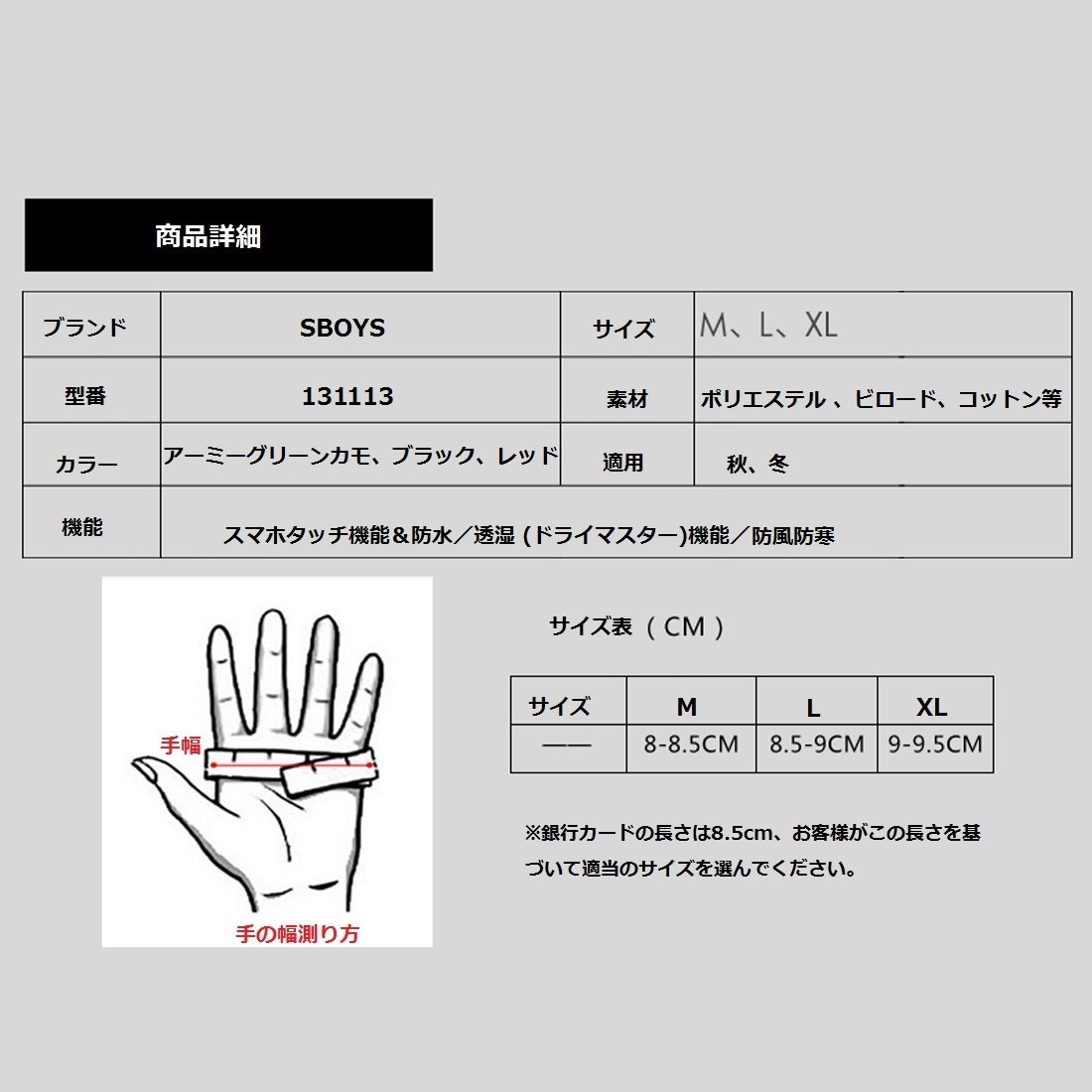Function: windproof cold insulation & touch panel compatible & waterproof / breathable (dry master) function