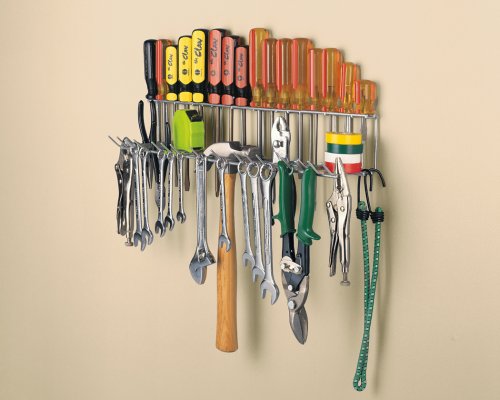 - Hooks hold crescent wrenches, hammers, snippers, pliers, and more