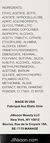All JINsoon formulas are 5-free: formulated without harsh chemicals such as formaldehyde, toluene, DBP, formaldehyde resin, and camphor. The double patented formula delivers a lasting manicure with bold, brilliant color, smooth application and the ultimate high gloss finish. No Animal Testing. Vegan Friendly.Feature