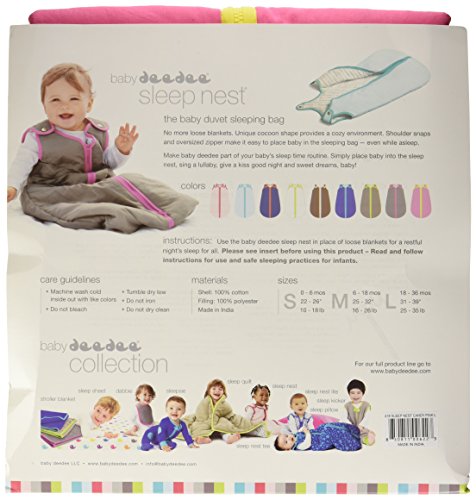 The baby deedee sleep nest is a quilted wearable duvet blanket for babies 0-36 months. Designed in a comforting cocoon-like shape to help baby feel cozy and secure, it's the perfect transition from the womb or swaddling stage. Unique shoulder snaps make it easy to place baby into the sleep nest, even while sleeping, in just 2 easy snaps. Small is suitable for babies 0-6 months and 10-18 lb. Medium is suitable for babies 6-18 months and 16-26 lb. Large is suitable for babies 18-36 months and 25-35 lb. Winter weight TOG 2.5Feature
