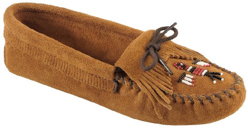 Minnetonka smooth Native American beaded thunderbird moccasin has a graduated fringe kiltie with a tie front. Attractive and comfortable, these moccasins are sure to become your favoriteAs an authorized retailer of Minnetonka Moccasin products, we cannot accept orders from outside the United States for Minnetonka products. We are very sorry for any inconvenience this may cause you.Feature