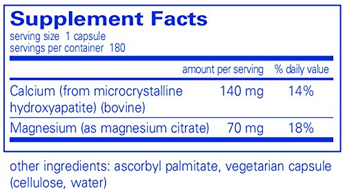 Calcium microcrystalline hydroxyapatite contains a mixture of bone minerals in their natural ratios, as well as residues of matrix, proteins, and glycosaminoglycans. Magnesium, like calcium, is an essential bone matrix mineral that promotes healthy bone metabolism. Supplementation with calcium and magnesium provides synergistic support for bone health. Magnesium also supports cardiovascular health by helping to maintain healthy levels of cellular and plasma electrolytes, including calcium and potassium. Additionally, calcium and magnesium may help to promote healthy lipid metabolism. This formula provides a 2:1 ratio of calcium to magnesium.
