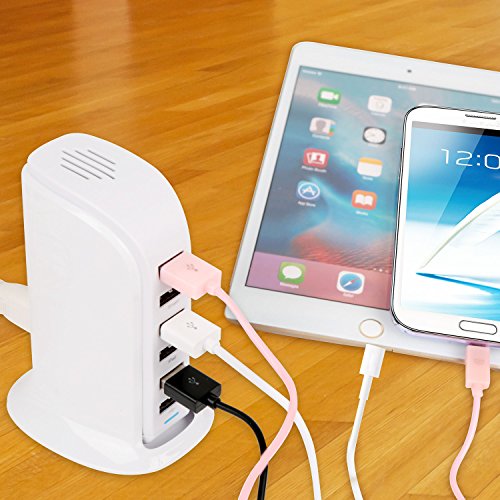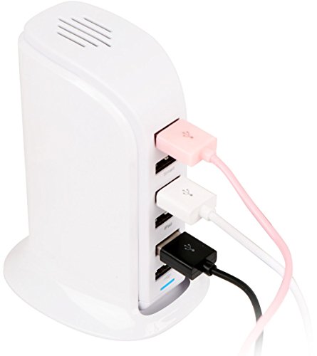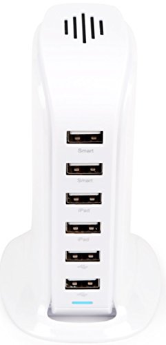This charger features six USB ports so it can charge devices simultaneously. It is powered by an AC cord that plugs into a standard electrical socket.