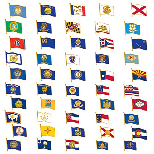 -. Feature : Collect all 50 of our State Shape Pins! This complete set includes 1 each of all 50 state flag pins. Save $98, more than half the cost of buying each pin individually. / Qty: 1 Pack/50 Total Pins / You receive a great collection of designed state flag pins that makes a perfect gift, commemorative item, or promotional piece. Pins are die struck from jeweler's metal, bold enamel colors, gold plated, and enamel color filled. / SIZE: 7/8"H x 7/8"W (incl. length of flag pole) / Each piece includes a standard clutch back and is individually poly bagged.