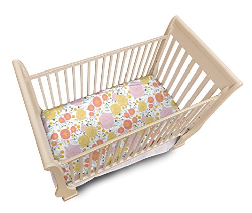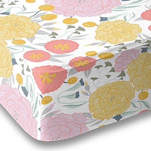 Floral on White Baby Fitted Crib Sheet Bedding, White with Coral Pink, Yellow, Seafoam Teal Flowers