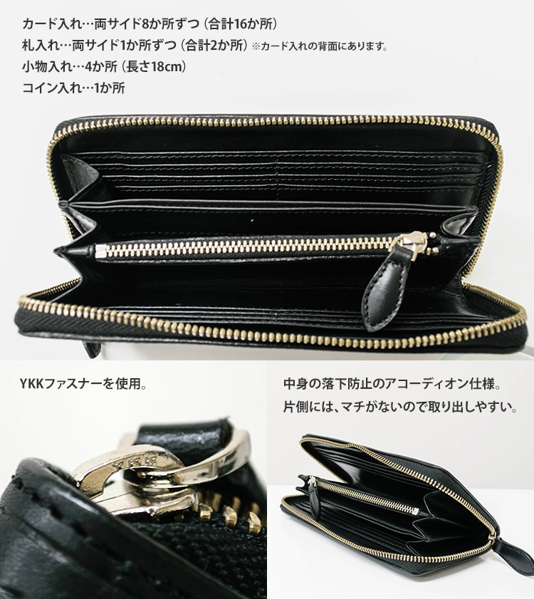 厚めの牛皮を丹念に植物タンニンでなめして仕上げられた素材をハンドメイドっで作りあげたラウンドファスナーウォレット。内側は片側だけをアコーディオンとしていますので大きく開口出来る為、今までの出し入れの困難さを解消しました!画期的な構造です。センター部分にはマチ付きのポケットがあり、レシートやメモなどがたっぷりと収納できます。オリジナルデザインのロングウォレットです。【サイズ】縦10.0cm × 横19.5cm × 厚み3.0cm【素材】牛革(本体 表・裏)【カラー】ブラウン / アイボリー【仕様】カード入れ…両サイド8か所ずつ(合計16か所)札入れ…両サイド1か所ずつ(合計2か所)※カード入れの背面にあります。コイン入れ…1か所小物入れ…4か所