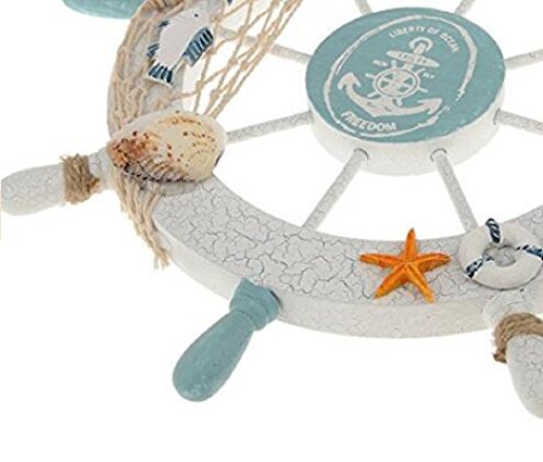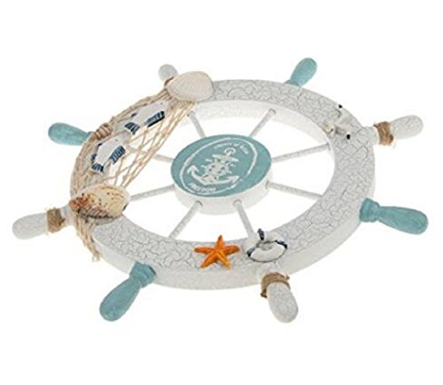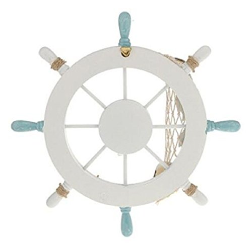 -. Feature : This wooden ship wheel with a fishing net, some shells and rope on it make it the perfect nautical wall hanging decor to accent your home. / Ideal for those who love sailing and nautical wall art, this beach decor wheel will leave your guests in awe. / This steering wheel has eight spokes painted light blue and white, surrounding it and is easily mountable to a wall in need of a beach decoration. / Size: 28 *28*3cm/11.02*11.02*1.18inch / Material: Wooden Color: White Pattern: Bird/Boat/Fish