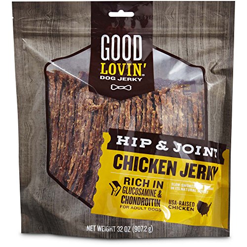-. Binding : Misc. -. Brand : Good Lovin' -. EAN : 0800443278314 -. Feature : Hip and Joint Chicken Jerky for Dogs from Good Lovin' / Slow-smoked and marinated in its natural juices / Rich in Glucosamine and chondroitin for adult dogs / Helps support healthy muscles, hips and joints / High source of protein -. Label : Good Lovin' -. Manufacturer : Good Lovin' -. MPN : GL-CJHJ32 -. PackageQuantity : 1 -. PartNumber : GL-CJHJ32 -. ProductGroup : Pet Products -. ProductTypeName : PET_SUPPLIES -. Publisher : Good Lovin' -. Studio : Good Lovin' -. Title : Good Lovin' Hip and Joint Chicken Jerky Adult Dog Treats, 32 oz. -. UPC : 800443278314