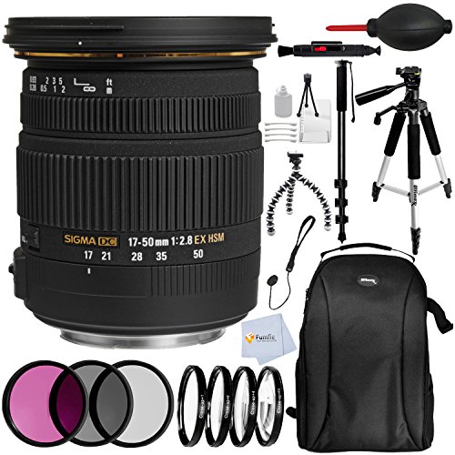 -. Title : Sigma 17-50mm f/2.8 EX DC OS HSM Zoom Lens for Nikon Cameras with APS-C Sensor - Includes 3PC Filter Kit + 4PC Macro Filter Set + 6.5" Tripod + 72" Monopod + 57" Tripod + Professional Backpack & More!