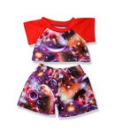 -. Feature : Teddy bear pajamas / cosmos pattern with red trim / planets and stars / 2 piece outfit / fits 15 inch plush