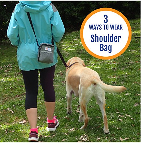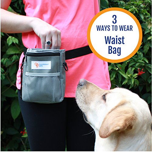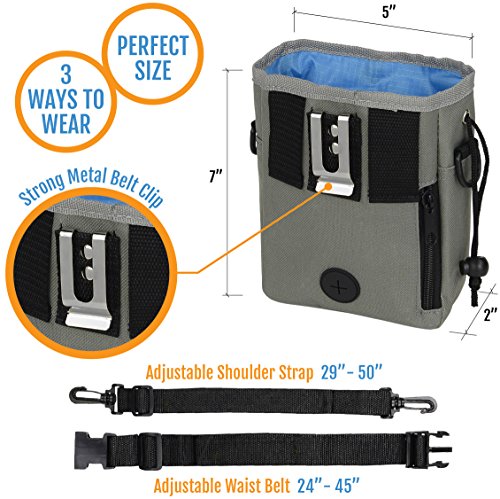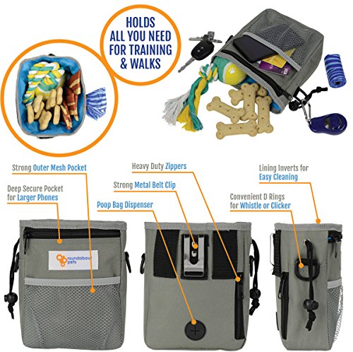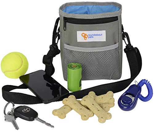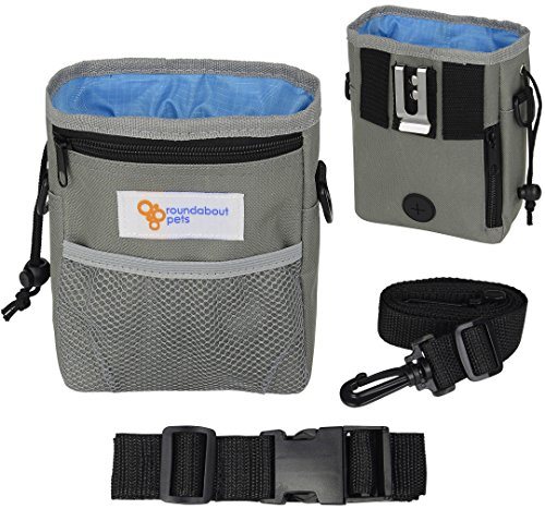 -. Feature : STORES ALL YOU NEED: Best for puppy, obedience and agility training or simply outdoor fun at the dog park. Large drawstring pouch safely holds doggy snacks, kibble, whistle, ball or toys / MULTIPLE STORAGE OPTIONS: Two large, secure zipper pockets keep your phone, money, cards or keys safe. Elasticized front mesh pouch for extra space. Perfect size: 7"x5"x2" / COMFORTABLE and VERSATILE: 3 WAYS TO WEAR. Use the strong metal belt clip; removable 50" shoulder strap or waistband adjustable to 45" / DESIGN INCLUDES: Storage and dispenser for roll of waste bags. Made from durable, lightweight, cool gray nylon fabric. Electric blue lining inverts for easy cleaning. 2 robust D-rings to attach a Clicker / BUY WITH CONFIDENCE-100% MONEY BACK GUARANTEE from Roundabout Pets if your DOG TREAT BAG does not meet your expectations! Ideal GIFT for a pet-loving friend. CLICK ADD TO CART NOW