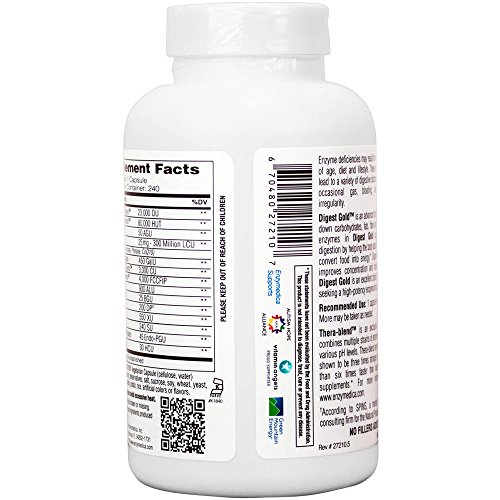 -. Binding : Health and Beauty -. Brand : Enzymedica -. EAN : 0730669478338 -. Feature : MOST ADVANCED ENZYME FORMULA: Breaks down carbohydrates, fats, fiber and proteins. The enzymes in Digest Gold support optimal digestion by helping the body absorb nutrients and convert food to energy. / EXCLUSIVE THERA-BLEND PROCESS: Digest Gold contains lipase, amylase, cellulase and protease Thera-blend enzymes for breaking down carbohydrates, fats, fiber and protein, respectively. Multiple strains of enzymes are combined to ensure that enzymes are activated at multiple pH levels. Thera-blend enzymes have been shown to be three times stronger and work more than six times faster than leading digestive supplements. / UNSURPASSED DIGESTIVE SUPPORT: The ATPro Blend is a combination of ATP, Magnesium, Citrate, Alpha Lipoic Acid, and CoQ10. Combining a full spectrum of digestive enzymes with ATPro Digest Gold offers unsurpassed digestive support. / FAST ACTING DIGESTIVE SUPPORT: Take one capsule before each meal and enjoy your food. No more upset tummies from the food you love. / CONTAINS NONE OF THE FOLLOWING: Egg, Dairy, Preservatives, Salt, Sucrose, Soy, Wheat, Yeast, Nuts, Corn, Gluten, Casein, Potato, Rice, Artificial Colors or Flavors. -. IsAdultProduct : 0 -. Label : Enzymedica -. LegalDisclaimer : The products and the claims made about specific products on or through this site have not been evaluated by the United States Food and Drug Administration and are not approved to diagnose, treat, cure or prevent disease. -. Manufacturer : Enzymedica -. MPN : 27210-FFP -. PackageQuantity : 1 -. PartNumber : 27210-FFP -. ProductGroup : Health and Beauty -. ProductTypeName : HEALTH_PERSONAL_CARE -. Publisher : Enzymedica -. Size : 240 -. Studio : Enzymedica -. Title : Enzymedica - Digest Gold with ATPro, Optimal Digestive Support, 240 Capsules (FFP) -. UPC : 730669478338